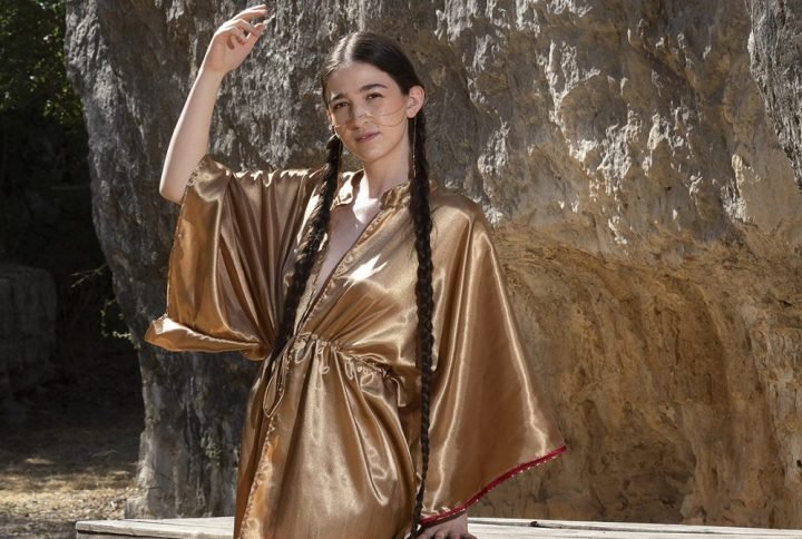 Presented in soft, flowing chamois fabric as a long, draped dress.