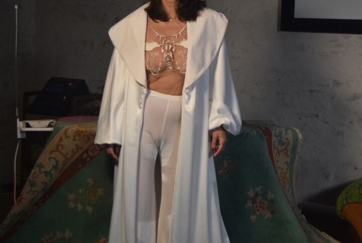 Presented in soft, flowing chamois fabric as a long, draped dress.