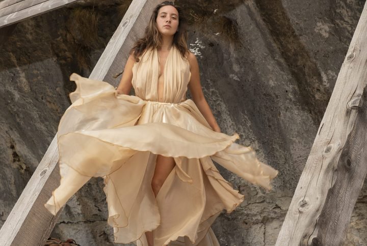 she rises as a vulva-shaped vision in layered white—textured yet lightweight fabric for effortless movement and natural flow.
