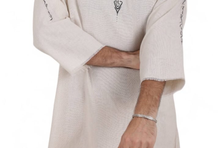 Presented in long-sleeve beige linen kimono, adorned with activated light codes.